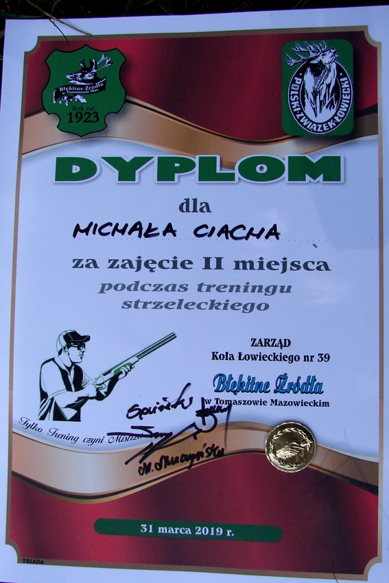 W niedzielę 31.03.2019 roku licznie przybyli myśliwi z Koła Łowieckiego”Błękitne Źródła” spotkali się na strzelnicy myśliwskiej w Piotrkowie Tryb. na corocznym , obowiązkowym treningu strzeleckim. Podczas treningu zostali wyłonieni najlepsi strzelcy, którzy będą reprezentować nasze Koło na okręgowych zawodach strzeleckich kół łowieckich. Najlepszym strzelcem po raz kolejny został kol. Rafał , który od Zarządu Koła otrzymał puchar , drugie miejsce zajął kol. Michał a trzecie kol Hubert -co warto podkreślić syn kol. Rafała. Wszyscy zwycięzcy otrzymali stosowne dyplomy. Dziękujemy wszystkim myśliwym oraz stażystom za udział w treningu. Od 01 kwietnia zaczynamy nowy sezon łowiecki 2019/2020.